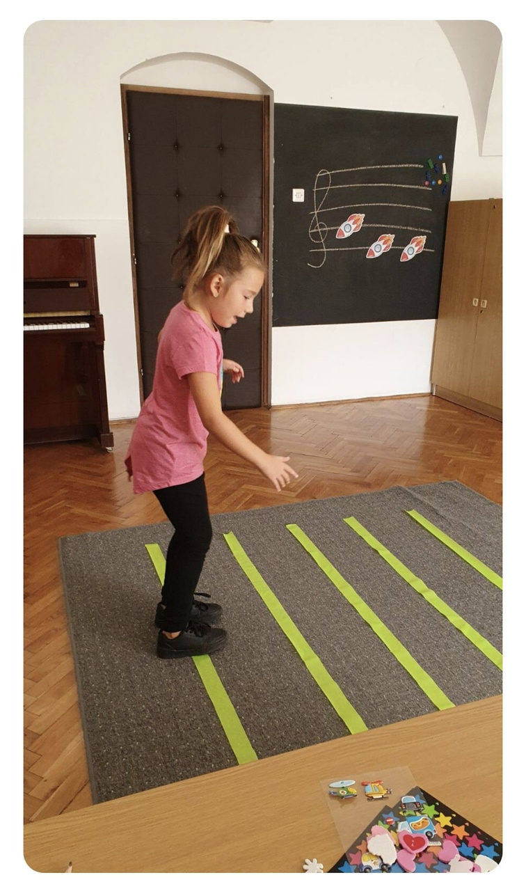 U glavnom dijelu sata učenici sami biraju u dodijeljenoj grupi tko će kojim redoslijedom izvoditi aktivnost, biraju jedinog učenika koji će okretati kartice i zadavati zadatke te bilježiti rezultate. Nastavnik objašnjava pravila igre (odabrani učenik zadaje ton okrećući karticu, skupina koja prva kreće s igrom ima 40 sec za savjet i usuglašavanje točnog odgovara, učenik koji izvodi aktivnost imenuje ton glazbenom abecedom te skače na veliko crtovlje na točno mjesto gdje se nalazi zadani ton, ako je odgovor netočan ili polovičan druga skupina ima pravo odgovoriti na postavljeni zadatak)